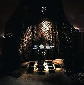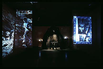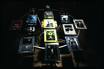 Whether this story can be substantiated or refuted is not of concern. There is much debate as to the true origin of the cards and it is probable that a real answer would be infinitely more mundane. I was attracted to the idea of entering a submerged, secret space where one would encounter the mysteries of the images; intangible, in that they could not be possessed directly, since they would be projections. Yet at one end of the hall the actual cards would be found, laid out on a table as if in preparation for a Tarot reading. A canopy or tent would enclose the table. One would enter from the East to view them. The table displaying the cards would be facing the viewer, as if in preparation for a reading.